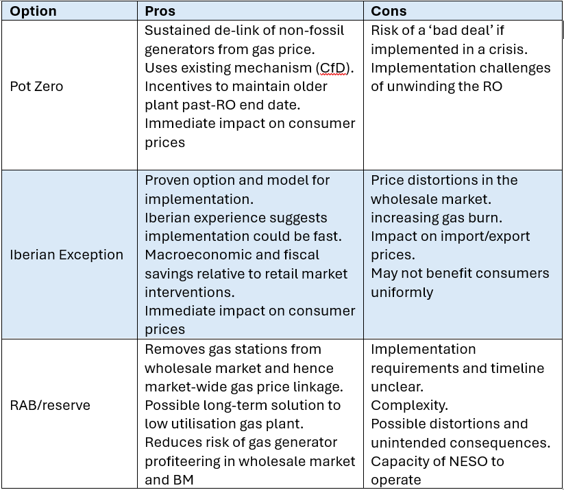 As a long-term structural change that deals with the declining load factors of gas-fired power stations the combination of a strategic reserve and gas-RAB model has considerable merit, and it is in this context that the idea was first mooted (although recently it has been promoted as a delinking mechanism). As a crisis response measure the approach could work, but only if it can be implemented quickly. If the idea is to be taken forward the implementation requirements need to be investigated urgently. Pot Zero was examined in detail during the previous crisis and uses an established mechanism (the CfD), and the Iberian Exception was implemented in practice in a broadly similar wholesale electricity market context. If proponents are right that the RAB/single buyer model can be implemented easily, and fast, then it meets the principal requirement of crisis intervention. If not, then it is better considered as a longer term shift that brings other benefits.